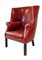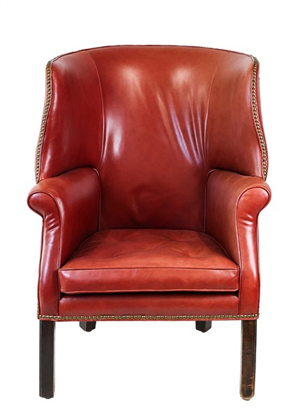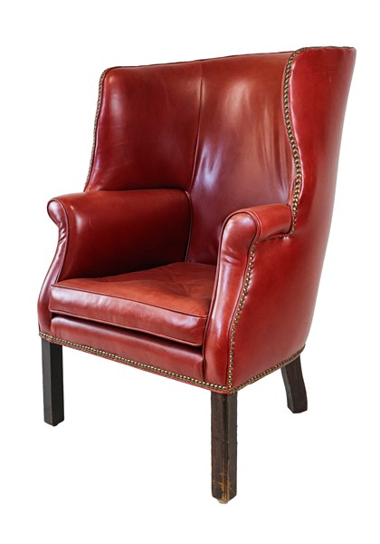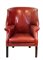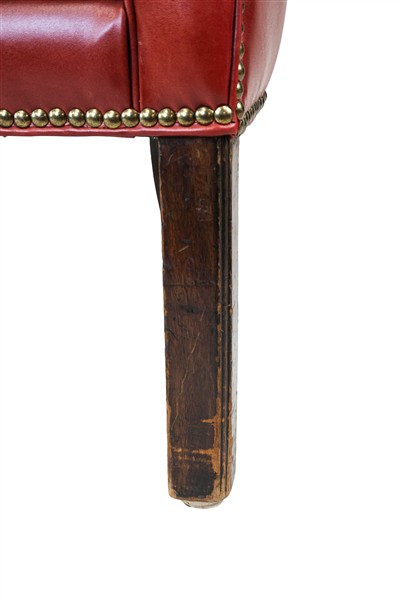 Poltrona a orecchioni di forma sagomata rivestita in pelle rossa borchiata. Inghilterra, secolo XX (difetti)