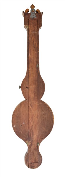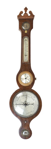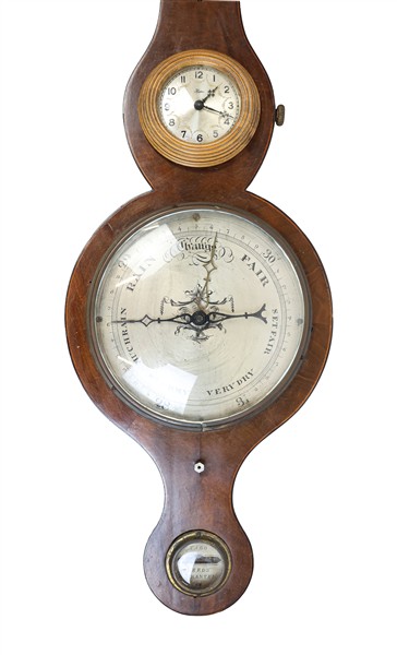 Barometro inglese in mogano filettato in legno chiaro con termometro del secolo XIX e orologio di epoca successiva (h. cm 80) (difetti e mancanze)