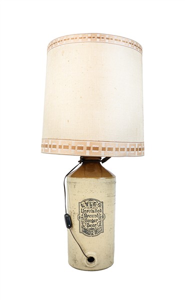 Lampada d'appoggio con base ricavata da un contenitore di birra in gres smaltato della fabbrica Lyle's Tunbridge Wells (UK), inizio secolo XX. Con paralume (h tot cm 84) (lievi difetti)