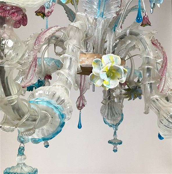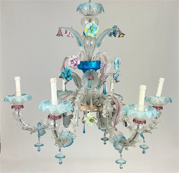 Manifattura di Murano. Lampadario a sei luci in vetro policromo decorato da fog