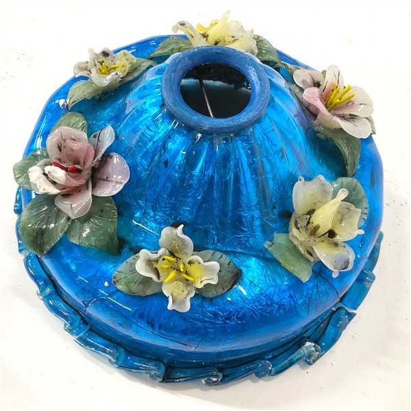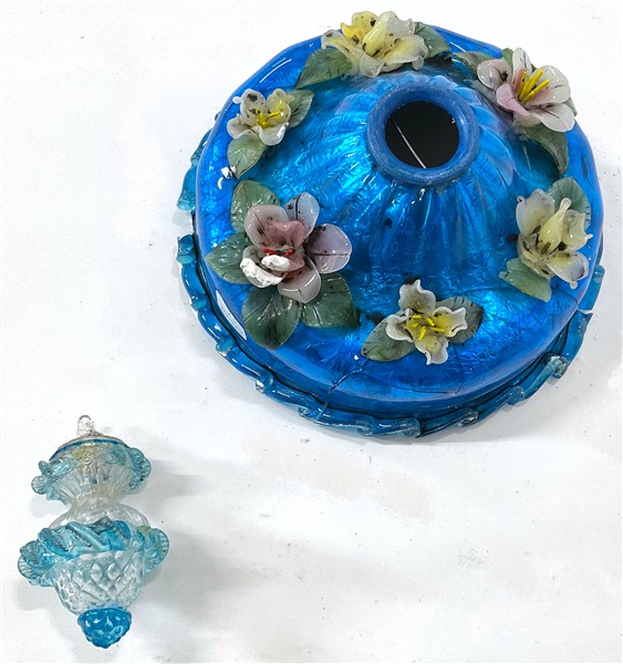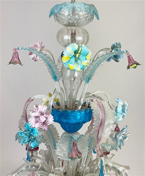 Manifattura di Murano. Lampadario a sei luci in vetro policromo decorato da foglie e fiori (h cm 88) (rotture, restauri e mancanze)