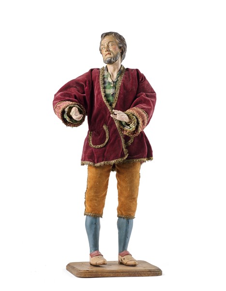 Arte napoletana, secolo XVIII. "Pastore barbuto con giacca in velluto" figura da pesepe con parti in legno intagliato e dipinto in policromia, occhi in pasta vitrea, abiti in tessuto con inserti in seta e fili di metallo dorato (h. cm 57) su base lignea non pertinente (difetti e mancanze)