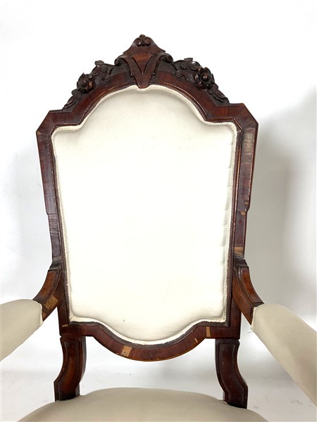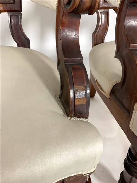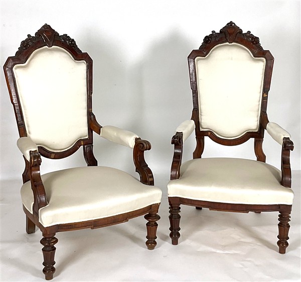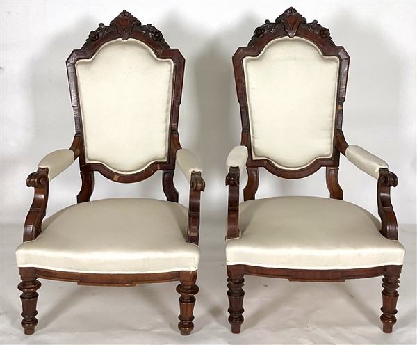 Coppia di poltrone in noce, schienale con cimasa intagliata a fiori. Gambe anteriori tornite, secolo XIX (difetti)