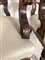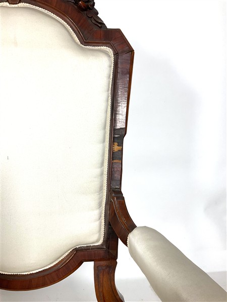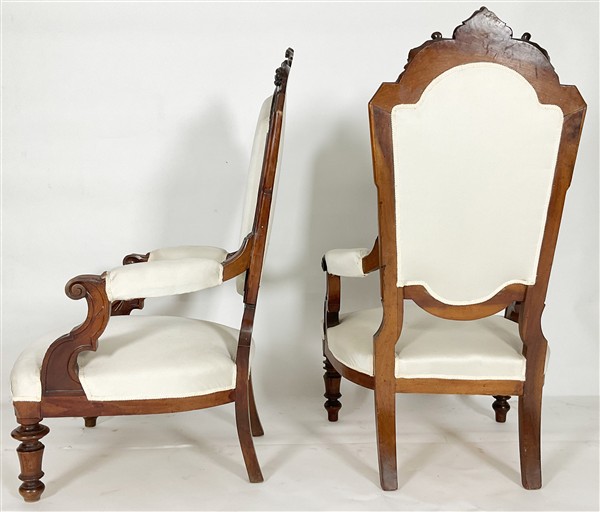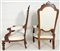 Coppia di poltrone in noce, schienale con cimasa intagliata a fiori. Gambe ante