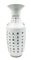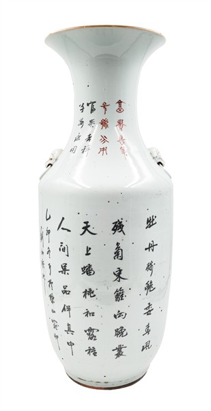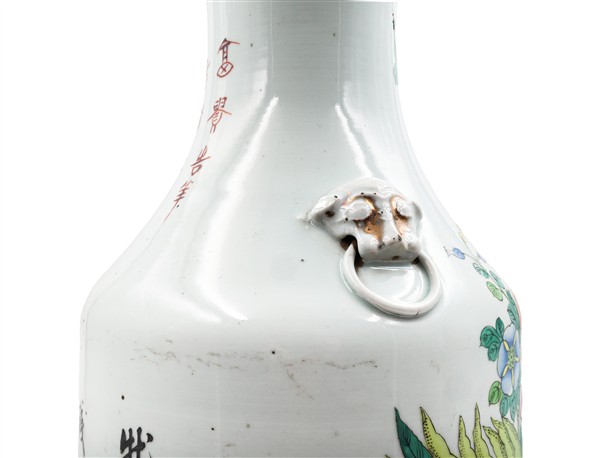 Vaso in porcellana policroma con peonie, fiori di pesco e decoro floreale, anse a teste leonine inanellate. Cina, secolo XX (h. cm 58,5) (difetti)