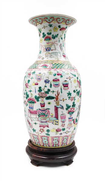 Vaso in porcellana policroma Famiglia Rosa decorato con oggetti, vasi di fiori