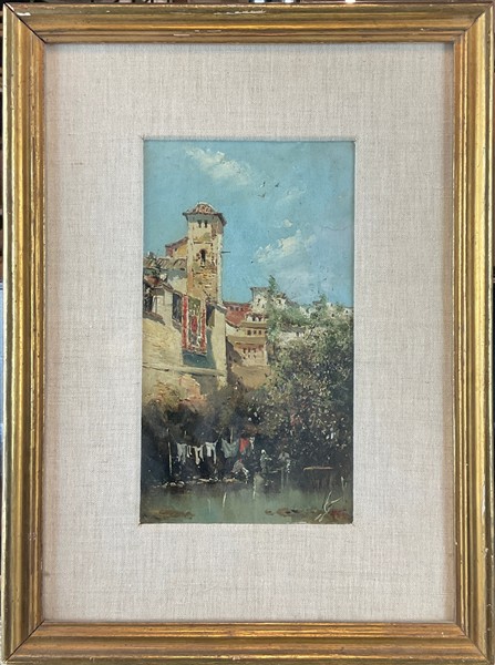 Lot 519 | Scuola spagnola del secolo XIX "Scorcio con lavandaie" olio su tela (cm 26,5x