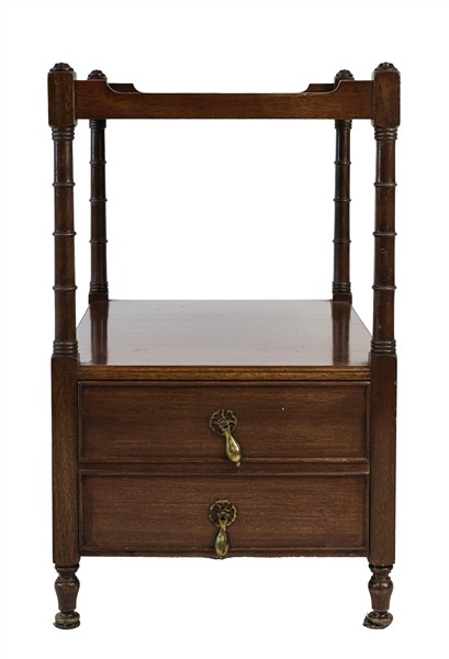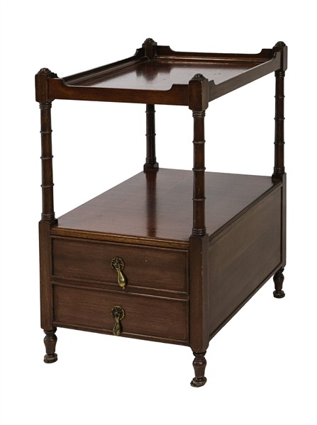 Mobiletto da centro in mogano a due ripiani e un cassetto laterale, sostegni torniti. Inghilterra, secolo XX (cm 50x66x39) (difetti)