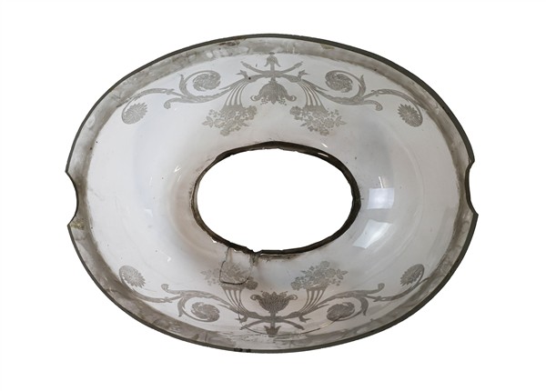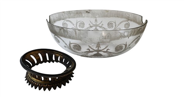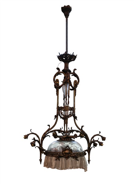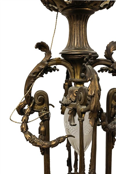 Lampadario in bronzo a quindici luci con bracci a rami fogliati e sostegni raccordati da festoni fioriti, calotta in vetro inciso a volute e motivi floreali. Inizio secolo XX. Paralumi in vetro a fiore adattati e staccati (cm 200x118x82 ca.) (difetti e rotture)