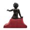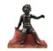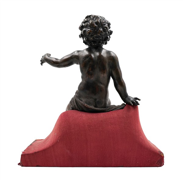 Arte del secolo XVIII-XIX. Scultura in bronzo raffigurante amorino assiso (h cm 31), base in legno sagomata e rivesta in tessuto rosso (difetti e mancanze)