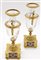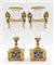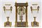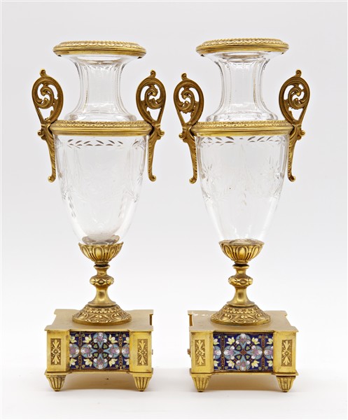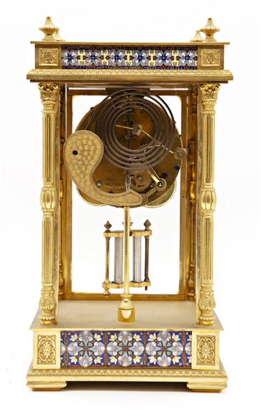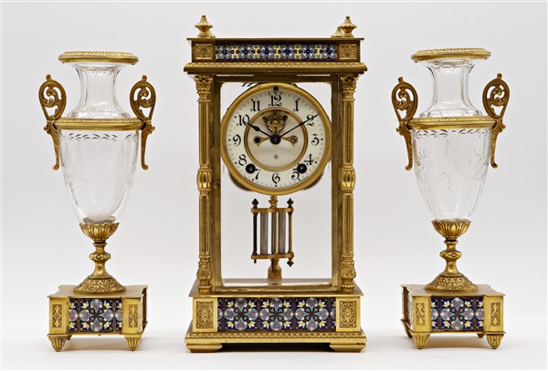 Trittico in ottone, vetri e smalti cloisonnè composto da una pendola da appoggio con cassa del tipo "cage" e due vasi biansati. Quadrante a fascia a numeri arabi. Movimento a due treni con scappamento "Brocot" e suoneria delle ore e mezze su gong. Il pendolo non è compensato ed è privo di mercurio. Fine secolo XIX (h. pendola cm 33,5) (difetti e mancanze)