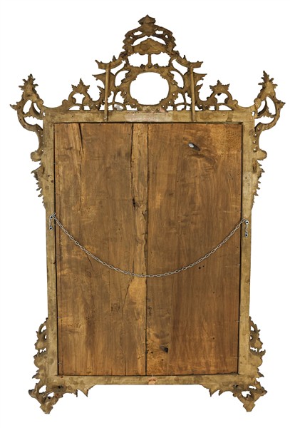Specchiera in legno intagliato e dipinto con fregi e cimasa traforata a volute, foglie e fiori. Secolo XIX (cm 155x100) (difetti e restauri)