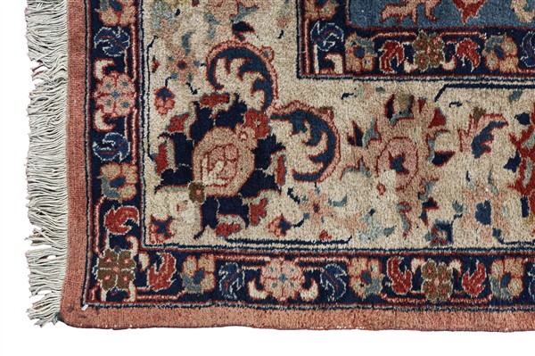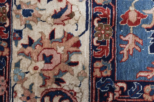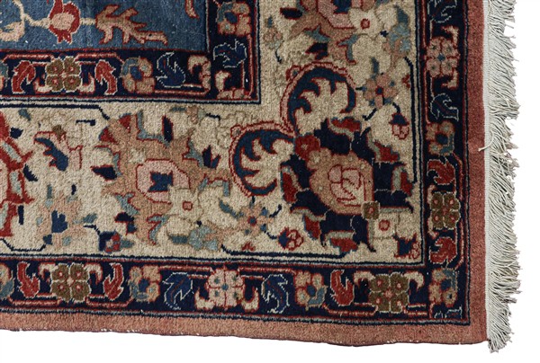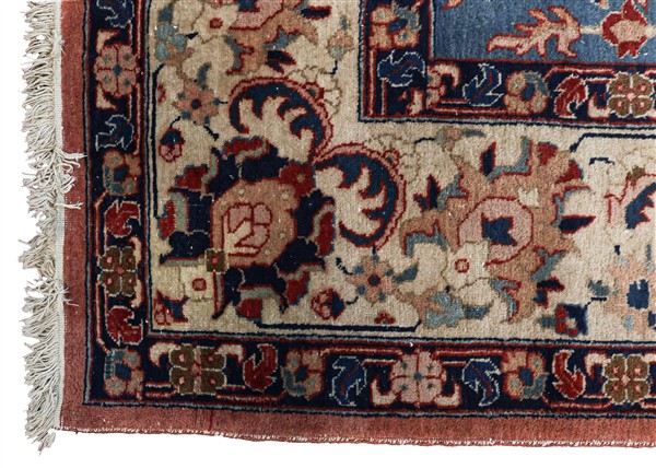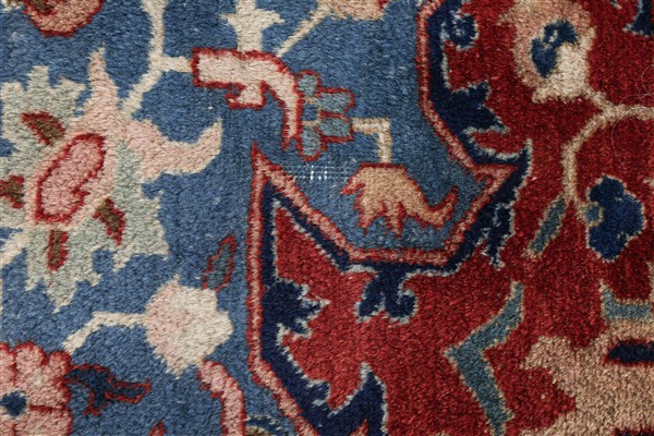 Tappeto Heritz, Persia, secolo XX. Decoro con grande medaglione e profili in policromia, cartiglio con iscrizione islamica alla testata (cm 338x262) (difetti e rapature)