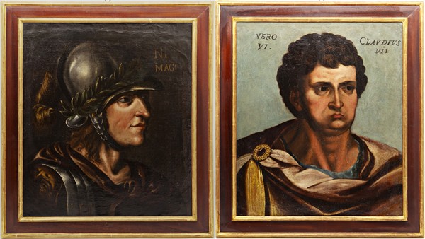 Coppia di dipinti ad olio su tela raffiguranti "Imperatori"