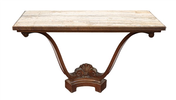 Console in noce con montanti mossi desinenti a ricciolo, piano in alabastro con
