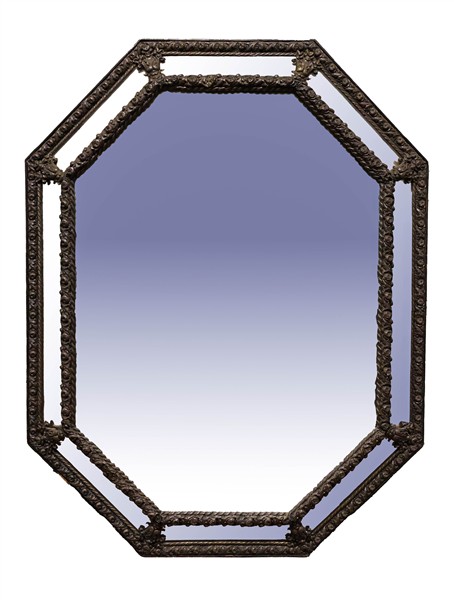 Specchiera di forma ottagonale a doppio ordine in legno rivestito in metallo sbalzato a fiori. Secolo XIX-XX (cm 135x106) (difetti)