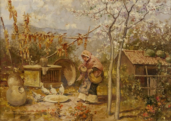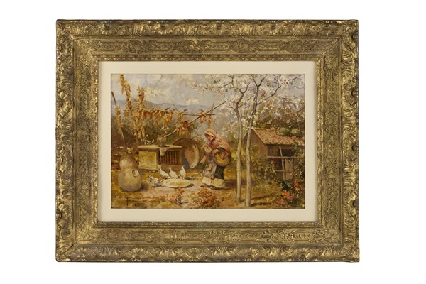 Riccardo Pellegrini "Contadina nell'aia" olio su cartone (cm 25x35) firmato in
