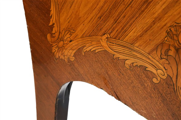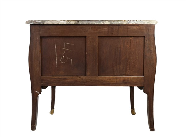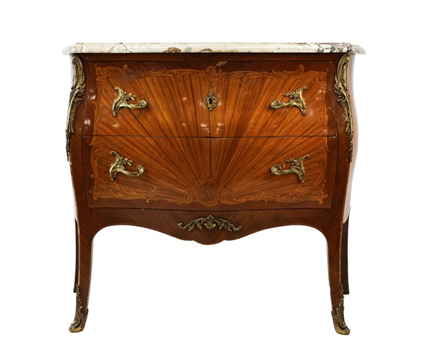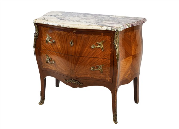 Cassettone di forma bombata impiallacciato in legni vari, fronte a due cassetti e fianchi intarsiati a cartelle con decoro a volute fogliate, fregi e guarnizioni in bronzo. Piano sagomato in marmo Fior di Pesco (cm 101x86x50) (difetti e restauri al piano)