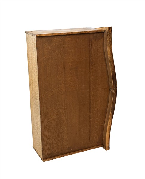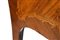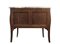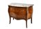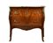 Cassettone di forma bombata impiallacciato in legni vari, fronte a due cassetti
