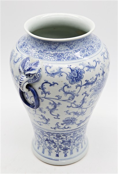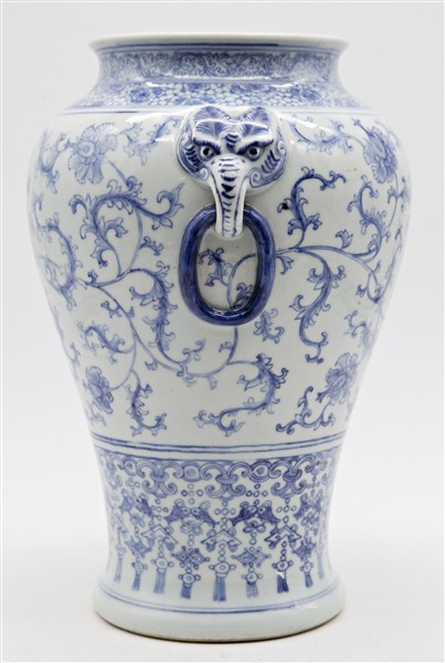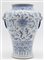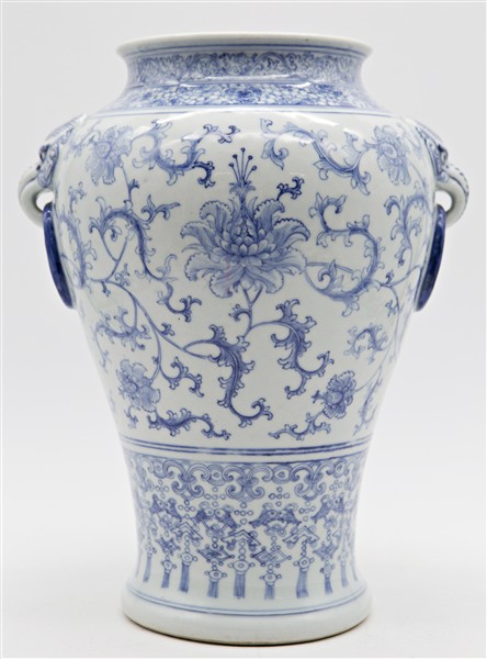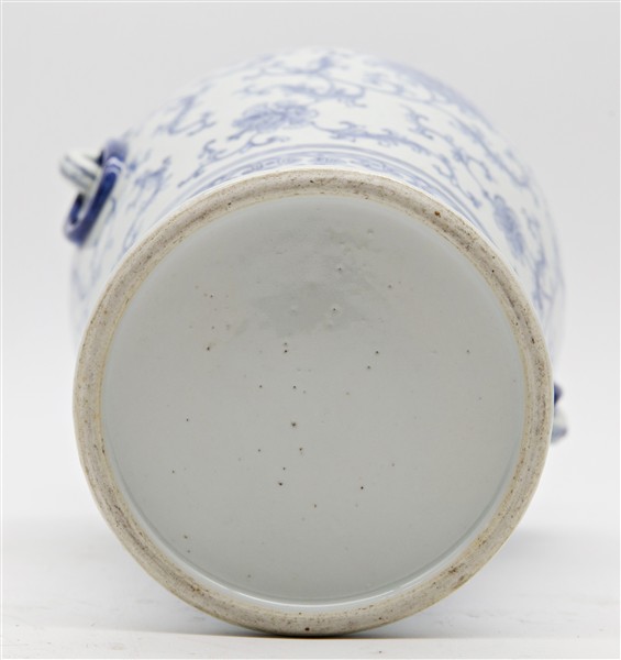 Vaso in porcellana bianco e blu decorato con fiori di loto. Cina, secolo XX (h cm 31,5) (difetti)