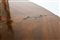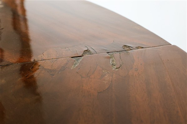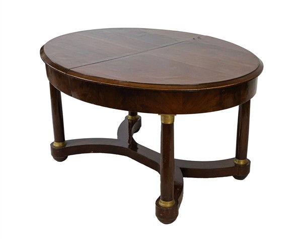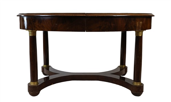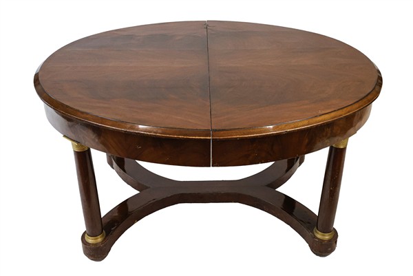 Tavolo allungabile di forma ovale impiallacciato in mogano e piuma di mogano, gambe a colonna raccordate da traverse incrociate con capitelli in bronzo dorato (chiuso cm 140x76x110) dotato di un allungo (L cm 40) (difetti)