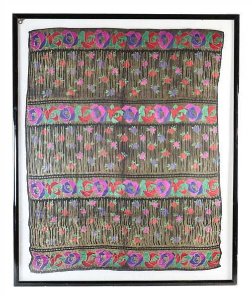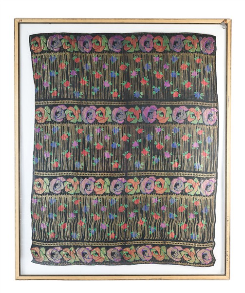 Manifattura di Vienna (?) probabilmente Jugendstil. Frammento di tessuto per abbigliamento in raso di seta e filo di metallo, decoro con motivo floreale stilizzato e fasce su fondo nero (cm 112x88) In cornice (difetti)
