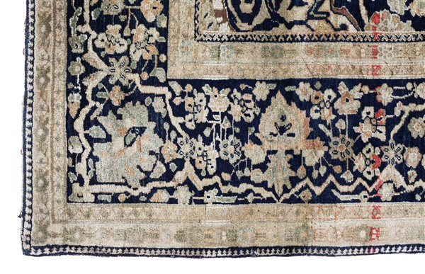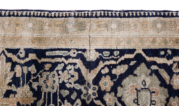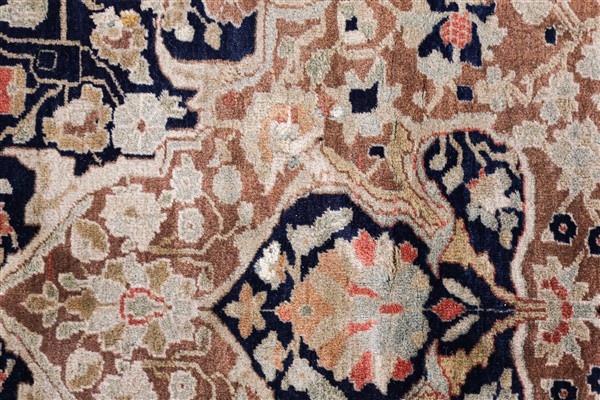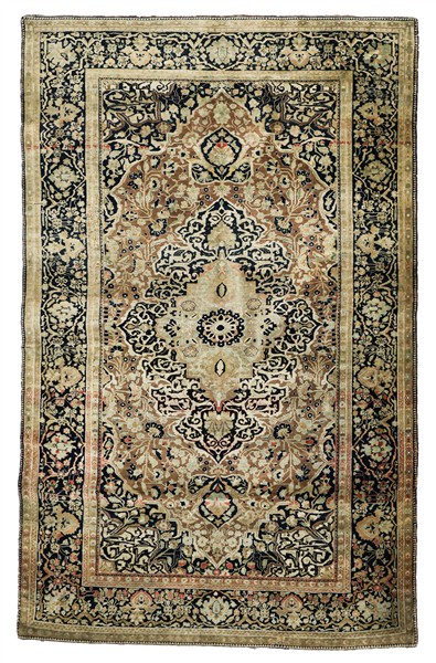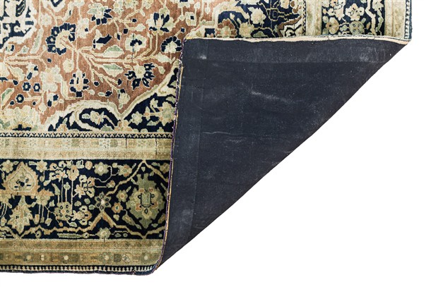Tappeto Shrinagar, India, secolo XX. Decoro con medaglione polilobato con grandi puntali su fondo nocciola (cm 196x124) (difetti)
