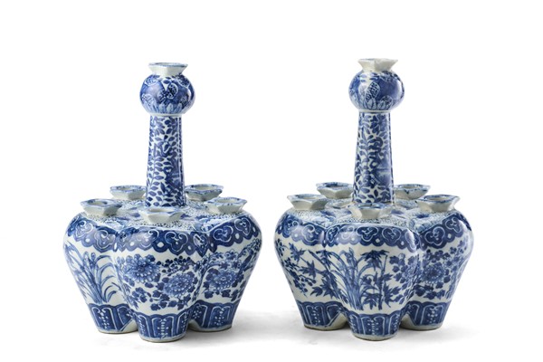 Lot 647 | Coppia di tulipaniere in porcellana bianca e blu dalla forma polilobata e con l