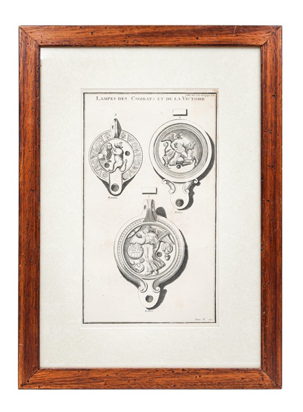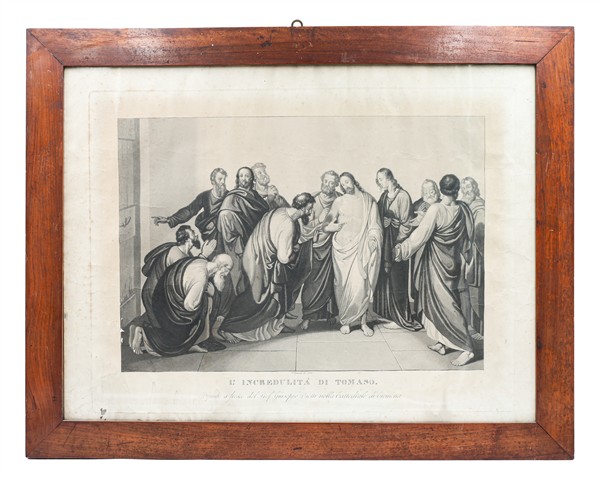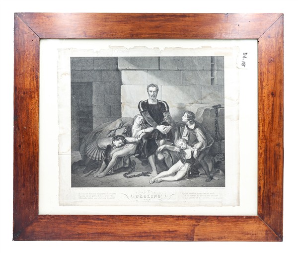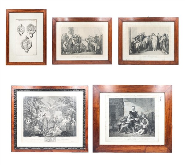 Lotto di cinque diverse incisioni all'acquaforte su carta a soggetto e misure diverse del secolo XIX, in cornici (difetti)
