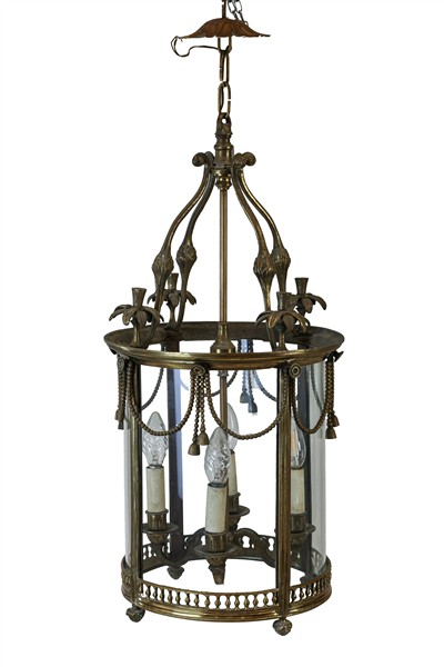 Lot 666 | Lanterna a sospensione in bronzo dorato e vetro di forma cilindrica con decori