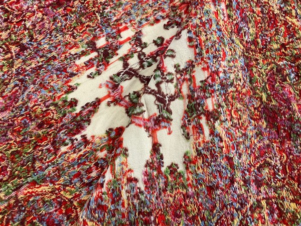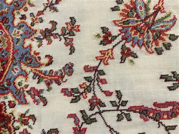 Scialle Kashmir, Inghilterra, prima metà del secolo XIX. Tessuto a mano in lana e seta con telaio a tiranti. Campo a fondo bianco decorato con racemi floreali policromi. Grande bordura con motivo cachemire del tipo madre figlia con un andamento in diagonale ripetuto specularmente e che invade il campo. La bordura minore e le piccole cornici sono decorate con motivo a meandro. Alle due testate le fasce colorate sono formate dagli orditi e di dimensioni ridotte (cm 158x150) (difetti, restauri e piccoli buchi)