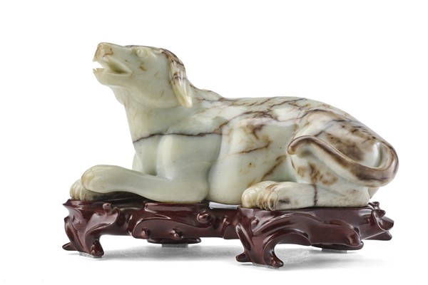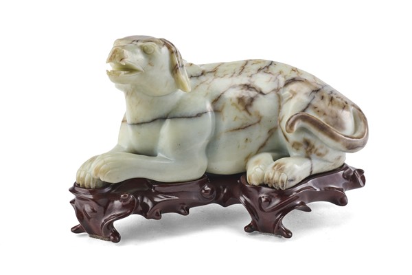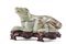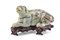 Cane accucciato con la testa rivolta verso l’alto in giada verde pallido, poggiante su base in legno