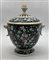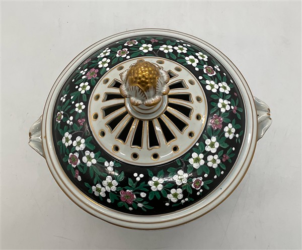 Vaso con coperchio traforato in porcellana dipinta in policromia a fiori su fon