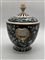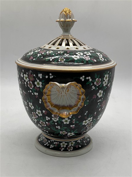 Vaso con coperchio traforato in porcellana dipinta in policromia a fiori su fondo nero con profili in oro, anse a valva di conchiglia e presa a pigna (h cm 30) (lievi difetti)