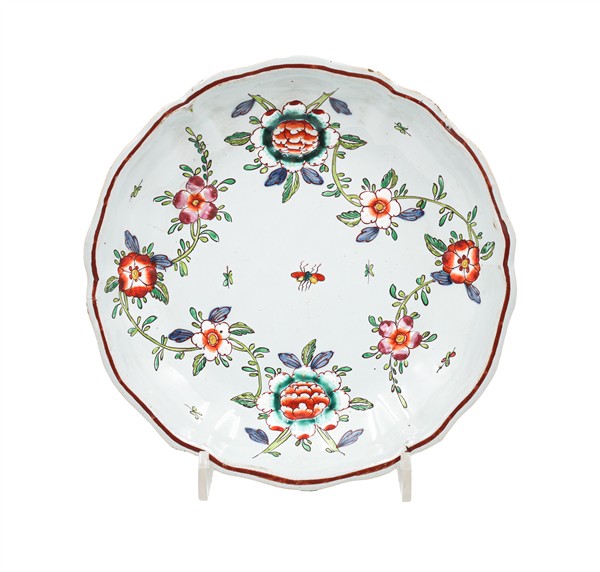 Manifattura di Pasquale Rubati, Milano, 1760-1780 circa. Fondina in maiolica dipinta policroma con decoro a rilievo alla ''barbottina'' (d cm 24) (difetti)
