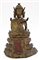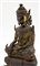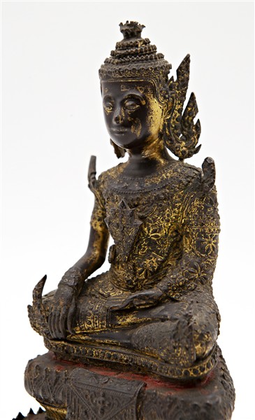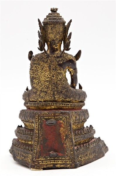 Buddha in bronzo parzialmente dorato, assiso su un alto trono in dhyanasana, co