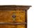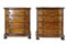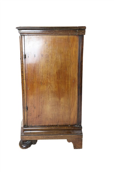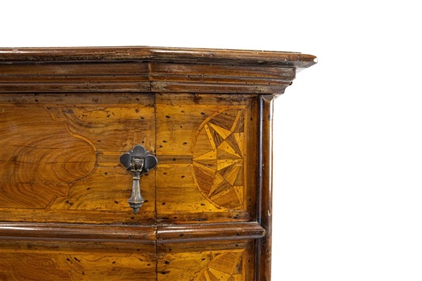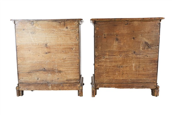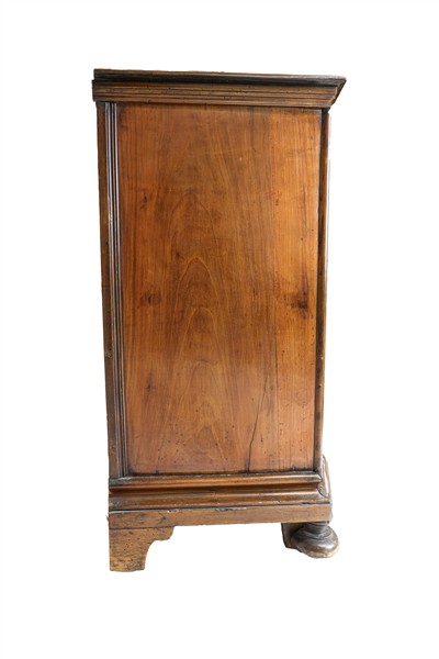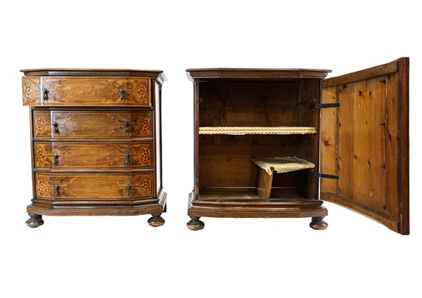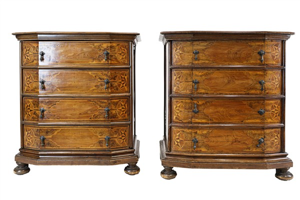 Coppia di mobiletti in noce con fronte mosso, uno ad un'anta con finti cassetti e uno a quattro cassetti, decorati da filettature e intarsi geometrici in legni vari, piedi anteriori a cipolla. Secolo XVIII (cm 79x87x50) (difetti e restauri)