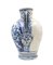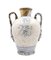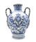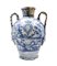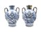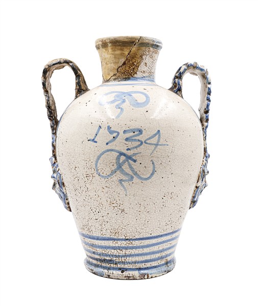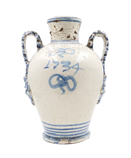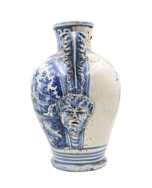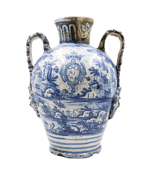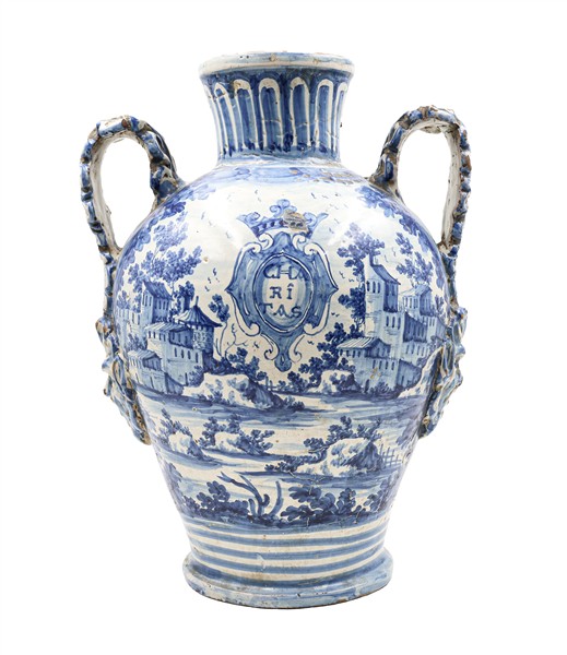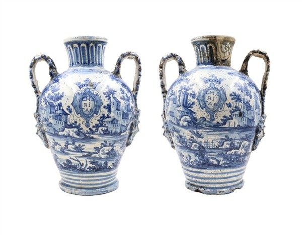 Manifattura di Napoli, secolo XVIII, probabile bottega dei Massa. Coppia di orci biansati in maiolica decorata in blu sul fronte a paesaggio e scudo coronato ed iscritto "Charitas", anse a foglia con attaccatura a mascherone, data "1734" al verso (h cm 42) (difetti e restauri)