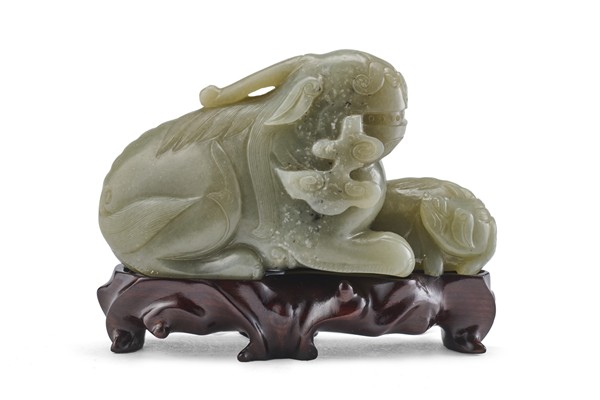 A soap-stone sculpture group depicting pho dog with lingzhi branch and puppy