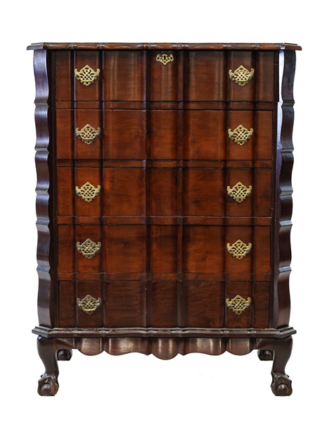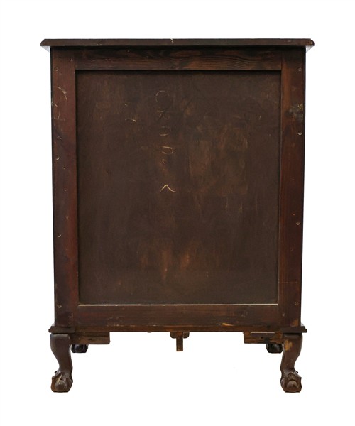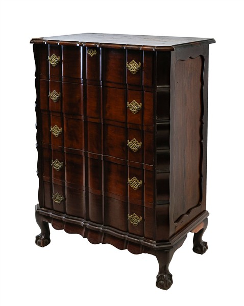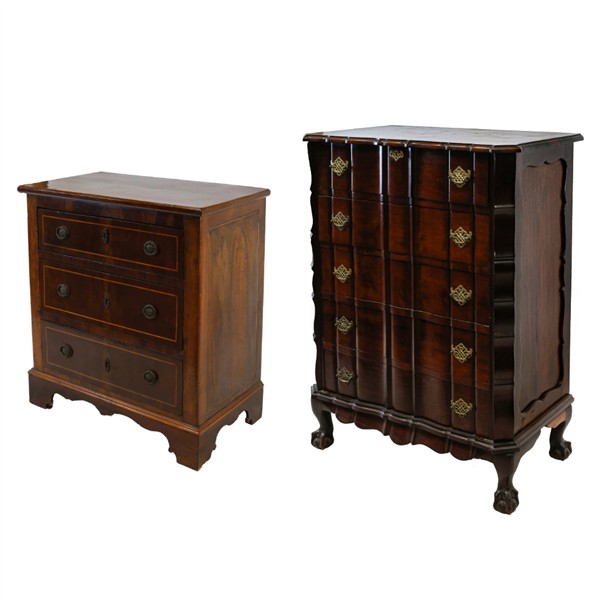 Lotto composto da due diversi mobili cassettiera in legni vari di cui uno con piedi ad artiglio su sfera (cm 88x115x51) e uno filettato con piedi a mensola (cm 77x84x45) (difetti e mancanze)
