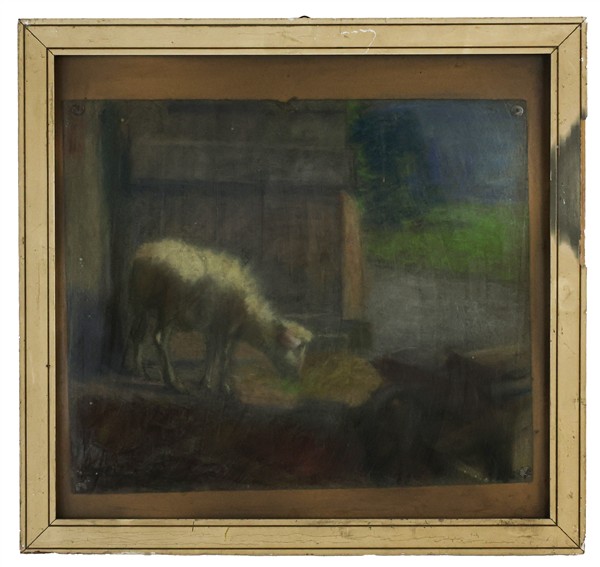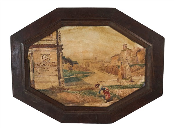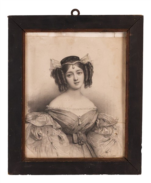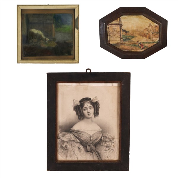 Lotto composto da un disegno a carboncino di Henri Grevedon raffigurante "Gentildonna", un acquerello del secolo XIX raffigurante "Fori imperiali"e un pastello colorato di fine secolo XIX raffigurante "Interno di stalla"