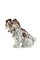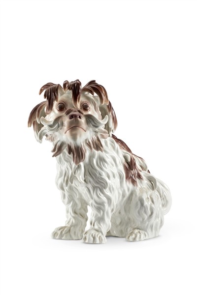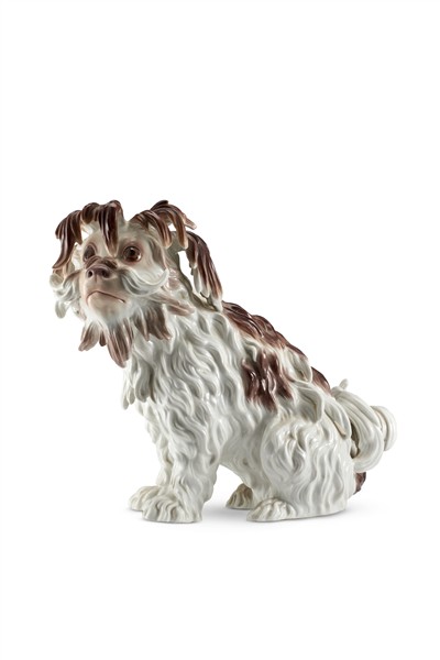 Manifattura di Meissen, secolo XIX, da un modello di J.J. Kaendler. Figura di cane bolognese in porcellana dipinta in policromia. Marca, numerali impressi ed etichetta sotto la base (L cm 29, h cm 23) (lievi difetti)