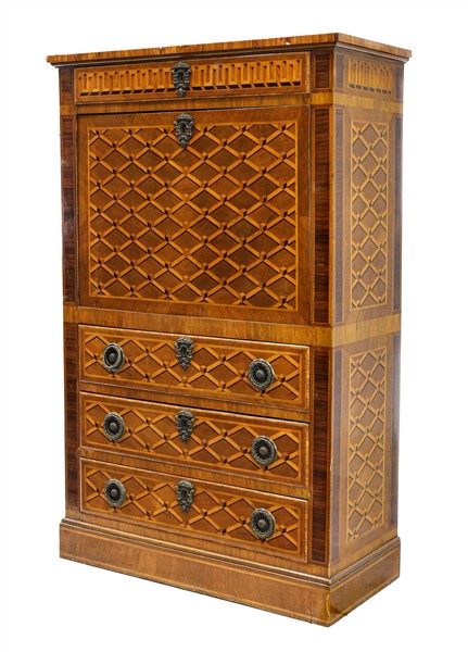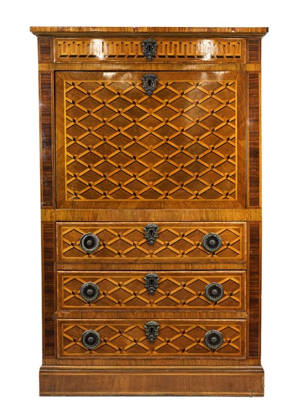Secretaire impiallacciato e intarsiato a marqueterie in legni di varie essenze.