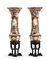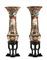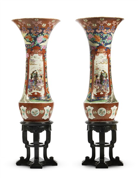 Coppia di grandi vasi in porcellana policroma Kutani a tromba con riserve decorate da figure in un giardino ed il fondo a motivi floreali, poggianti su due basi in legno