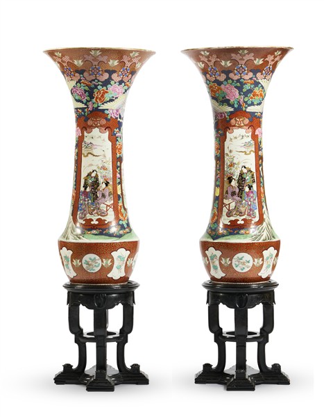 A large pair of Arita porcelain trumpet vases with reserves decorated by figures in a garden and floral motifs, on two wooden bases