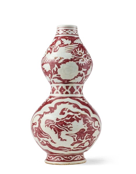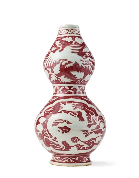 Vaso a doppia zucca in porcellana policroma rosso ferro e bianca con decori di fenici e draghi.