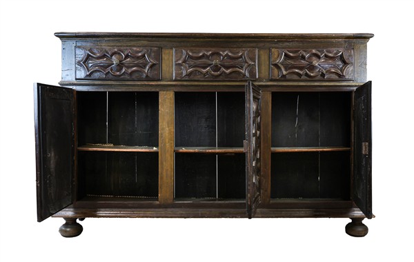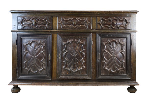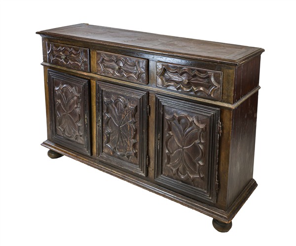 Antica credenza piemontese in legni vari a tre ante pannellate e tre cassetti intagliati col motivo "a ragnatela" (cm 185x120x53) (difetti)
