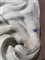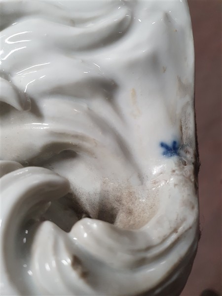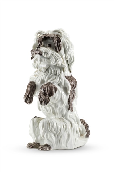 Manifattura di Samson, secolo XIX. Figura di cane bolognese in porcellana dipinta in policromia. Marca alla base (h cm 30) (difetti)