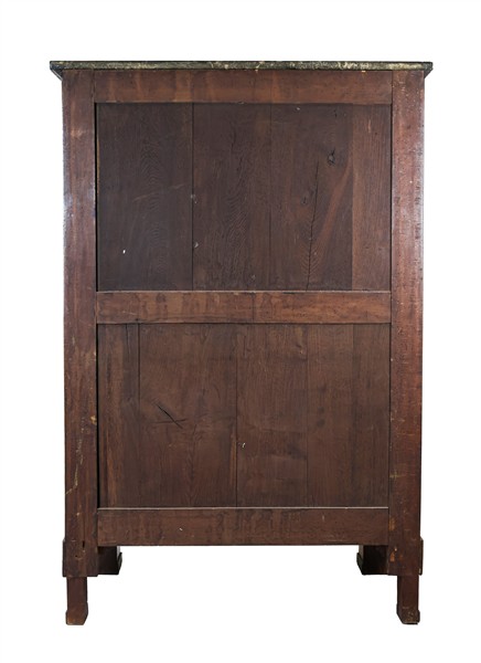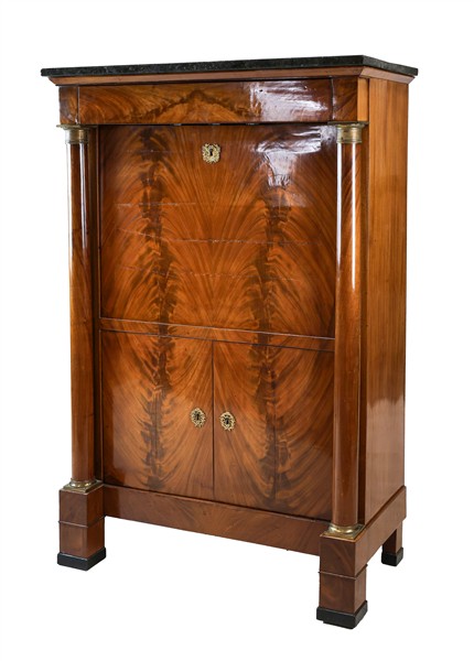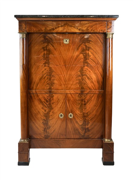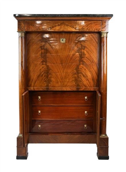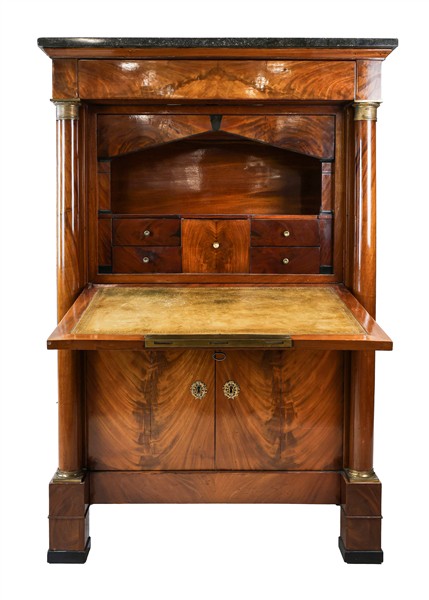 Secretaire in mogano massello e piuma di mogano, parte inferiore a due sportelli celanti tre cassetti e calatoia che rivela tiretti e vano a giorno, piano con inserto in pelle e greca impressa, colonne con capitelli e guarnizioni in metallo su base a plinto, piano in marmo nero. Prima metà secolo XIX (cm 96x143x45) (difetti e restauri)