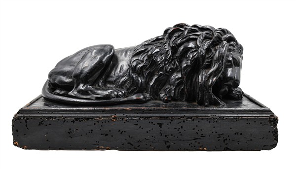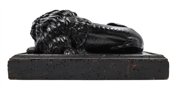 Arte del secolo XIX. Leone dormiente, legno intagliato ed ebanizzato (cm 33x15x